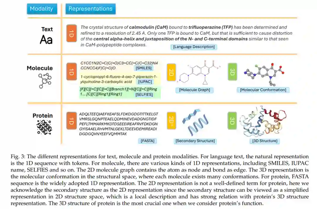 在本节中,我们简洁回顾了生物分子的各种表示及相关建模方法。一般来说,语言文本、分子和蛋白质的模态可以用不同的表示来观察,如1D序列、2D图和3D结构。不同模态及其表示方法的总结在图3中呈现。此外,本节介绍的不同模态的现有BL模型开发的时间顺序概述在图2中展示。这些模型的介绍和更多细节贯穿整个综述。
