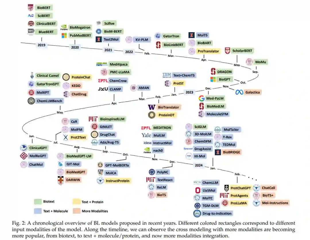尽管这些基于深度学习的表示方法对于从不同抽象层次捕获固有的生物分子特征非常有力,但它们通常忽视了如生物医学文献和数据库等丰富的外部知识来源。例如,PubMed包含大量关于生物分子的注释和详细实验发现的出版物。像PubChem和UniProtKB这样的资源同样汇编了已知生物分子的无数属性、功能和相互作用。直觉上,这些外部知识来源提供了生物分子的广泛多面向文本描述,提供了从分子表示中缺失的语言上下文。然而,当前的生物分子建模范式在系统利用这些丰富的语言数据构建更全面模型的能力上受到限制。 在计算机视觉(CV)和自然语言处理(NLP)技术融合的背景下,多模态建模取得了显著进展。如PaLM、BLIP2和LLaVA等模型有效地整合了图像和文本等不同数据类型,以开发对复杂现实世界领域的更丰富理解。在此势头上建立,尤其是像GPT-4、LLaMA和Alpaca这样的大型预训练语言模型(LLMs)的发展,激发了对生物分子和自然语言联合建模的新兴兴趣。