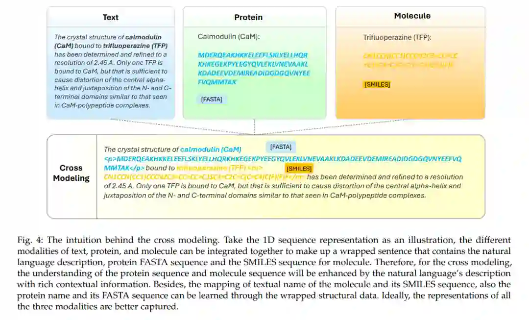 跨模型的直觉 跨模型整合生物分子与自然语言旨在克服传统生物分子表示固有的局限性。尽管现有的表示方法可以有效捕捉生物分子的固有属性,但它们常常忽略了可以进一步丰富理解的外部知识。这种外部知识,可通过生物学文献、数据库和知识图谱等各种格式访问,提供了对生物分子更广泛的生物学背景和功能方面的全面描述和见解。例如,考虑一个分子M,其毒性特征在科学文本中有详细描述。基于这类文本预训练的模型装备有推断类似新分子M'的潜在毒性的能力。此外,语言为生物分子设计提供了一种更灵活的媒介。通过生物分子和语言的集成建模,模型可以利用广泛的生物学知识来执行与生物分子相关的任务,实现对分子生成和编辑的更细致控制。这种整合促进了对广阔分子空间的探索,允许创造具有所需属性的新生物分子。为了更好地说明,我们在图4中展示了这些模态的序列表示如何在跨模型中整合。与单一模态建模不同,分子(SMILES)和蛋白质(FASTA)的序列表示被整合成一个包含自然语言描述的包裹句子,这提供了更丰富的上下文信息,以便更好地理解分子和蛋白质。