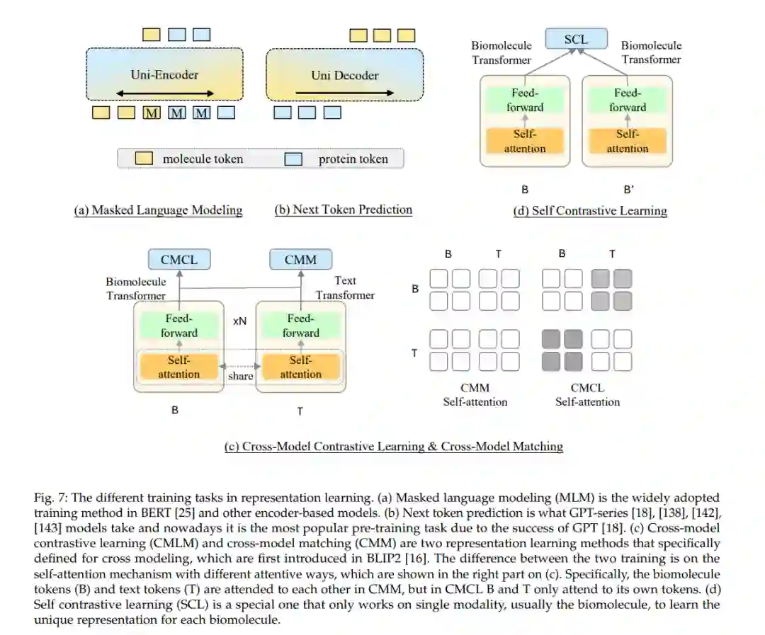 单模态预训练专注于增强对单一模态的理解,包括分子、蛋白质和文本数据,以提高模型在特定领域内的性能。相比之下,跨模态预训练旨在在这些不同模态之间建立相互联系,促进跨领域的更加整合的理解。在这里,我们详细阐述了在研究社区内获得广泛接受的训练任务和策略。另外,我们在7.1节中列举了各种预训练数据资源。