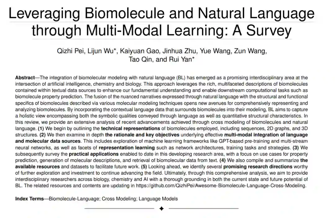 生物分子建模与自然语言(BL)的整合已经成为一个前景光明的跨学科领域,位于人工智能、化学和生物学的交汇处。这种方法利用文本数据源中包含的关于生物分子的丰富、多面的描述来增强我们的基本理解,并使下游计算任务成为可能,如生物分子属性预测。将通过自然语言表达的细腻叙述与通过各种分子建模技术描述的生物分子的结构和功能特性的融合,为全面表示和分析生物分子开辟了新途径。通过将围绕生物分子的上下文语言数据纳入其建模中,BL旨在捕捉一个全面视角,包括通过语言传达的象征性质以及量化的结构特性。在这篇综述中,我们提供了通过生物分子和自然语言的交叉建模所取得的最新进展的广泛分析。(1)我们首先概述了采用的生物分子的技术表示,包括序列、二维图和三维结构。(2)然后我们深入探讨了有效多模态整合语言和分子数据源的基本原理和主要目标。这包括探索机器学习框架,如基于GPT的预训练和多流神经网络,以及表示学习的各个方面,如网络架构、训练任务和策略。(3)随后我们调研了到目前为止在这个发展中的研究领域中启用的实际应用,重点是属性预测、分子描述的生成和从文本中检索生物分子数据的用例。(4)我们还汇编和总结了可用的资源和数据集,以促进未来的工作。(5)展望未来,我们确定了几个有前景的研究方向,值得进一步探索和投资,以继续推进该领域的发展。最终,通过这一全面分析,我们旨在为生物学、化学和AI领域的跨学科研究者提供当前状态和BL未来潜力的彻底基础。相关资源和内容在更新中 https://github.com/QizhiPei/Awesome-Biomolecule-Language-Cross-Modeling。