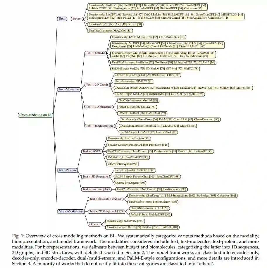 虽然通过像BioT5和KV-PLM这样的方法在联合建模生物分子和自然语言方面取得了显著进展,但目前这个领域缺乏一个全面调查进展和正在开发的各种方法的统一资源。为了填补这一空缺,我们提出了一个关于生物分子和语言的跨模态整合的广泛综述,我们将其称为跨生物分子-语言(BL)建模。