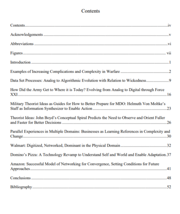 在许多相同的挑战性条件下进行区域和全球竞争。不断发展的全球供应链,互联网的连通性,以及来自新的商业对手的更多竞争,呈现出一个不断变化的世界,在这个世界上,他们不仅必须生存,而且必须兴旺。他们的竞争步伐是持续的,有些公司已经存在了几十年。这为在与美国陆军类似的条件下对技术、组织和领导的替代方法提供了宝贵的观察和评估。本文不仅考虑了军事指挥官和参谋部规划人员背景下的领导者,而且考虑了在其领域内成功竞争的跨国公司的高管。它还关注支持陆军行动的信息架构的演变所带来的机会。架构的演变可以更好地支持MDO和融合中的系统和决策工作。本报告首先探讨了全球作战环境和军事能力所依据的系统的复杂性增加,产生了越来越多的、难以处理的数据集。这些复杂的挑战增加了作战环境的邪恶性,这是领导者和作战艺术家的一个关键责任,他们要尽可能地驯服,并作出决定或采取行动,以便在一个或多个领域成功竞争。