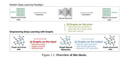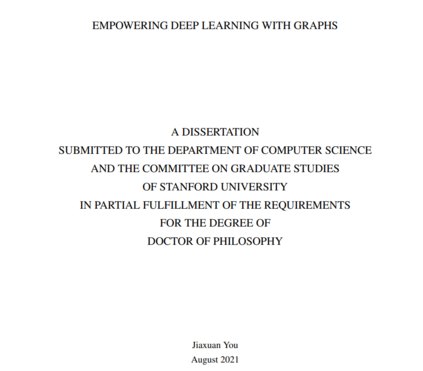 深度学习重塑了人工智能的研究和应用。现代深度学习模型主要是为规则结构的数据设计的,如序列和图像。这些模型是为将这些规则结构的数据作为输入(例如分类、回归)、作为输出(例如生成)或作为结构先验(例如神经架构设计)的任务而建立的。然而,并非所有形式的数据都是规则结构的。一个值得注意的例子是图结构数据,这是一种通用而强大的数据结构,它以简洁的形式表示实体及其关系。虽然图结构数据在自然和社会科学中无处不在,但它是离散的和非i.i.d的。大自然给现代深度学习模型带来了独特的挑战。本文旨在通过促进深度学习模型将图作为输入、输出和先验,以图结构数据为深度学习赋能。我在这三个方向的研究为深度学习的研究开辟了新的前沿:(1)基于深度学习的图学习。开发了具有表现力的有效深度学习方法,可以将图作为输入,促进了图的学习和理解。(2)基于深度学习的图生成。用深度学习模型规范了图的生成过程,促进了图的发现和设计。(3)图作为深度学习的先验。发现图结构可以作为神经架构和机器学习任务的强大先验,为深度学习的设计和理解打开了一个新的方向。讨论了上述技术的广泛应用,包括推荐系统、药物发现、神经架构设计和缺失数据填补。