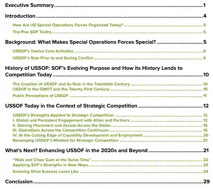美国特种作战部队(USSOF)可以极大地帮助应对复杂的战略竞争,但这些资产往往被忽视或误解。USSOF 经常被视为全球反恐战争时代的直接行动终结部队。然而,2024 年的特种作战人员不仅是身体强壮的 "扣动扳机者",也是精通编码的年轻人。USSOF 具有独特的地位,使其能够提升联合部队驾驭整个竞争范围的能力。其在冲突前的活动,如环境作战准备(OPE),可塑造与美国竞争对手的战略环境。本报告认为,如能有效利用,USSOF 有可能在维持美国全球利益方面发挥关键作用,特别是在解决整个竞争过程中的薄弱环节方面。