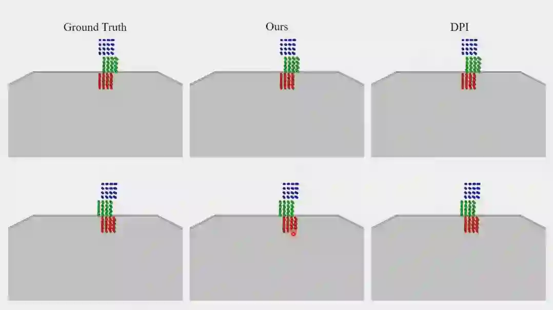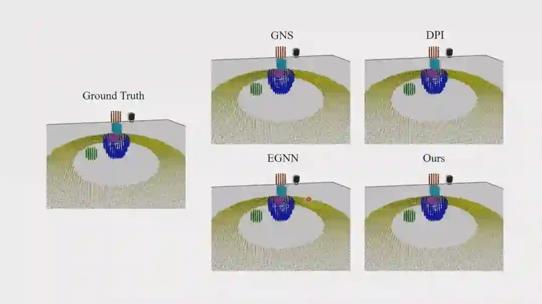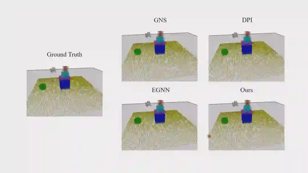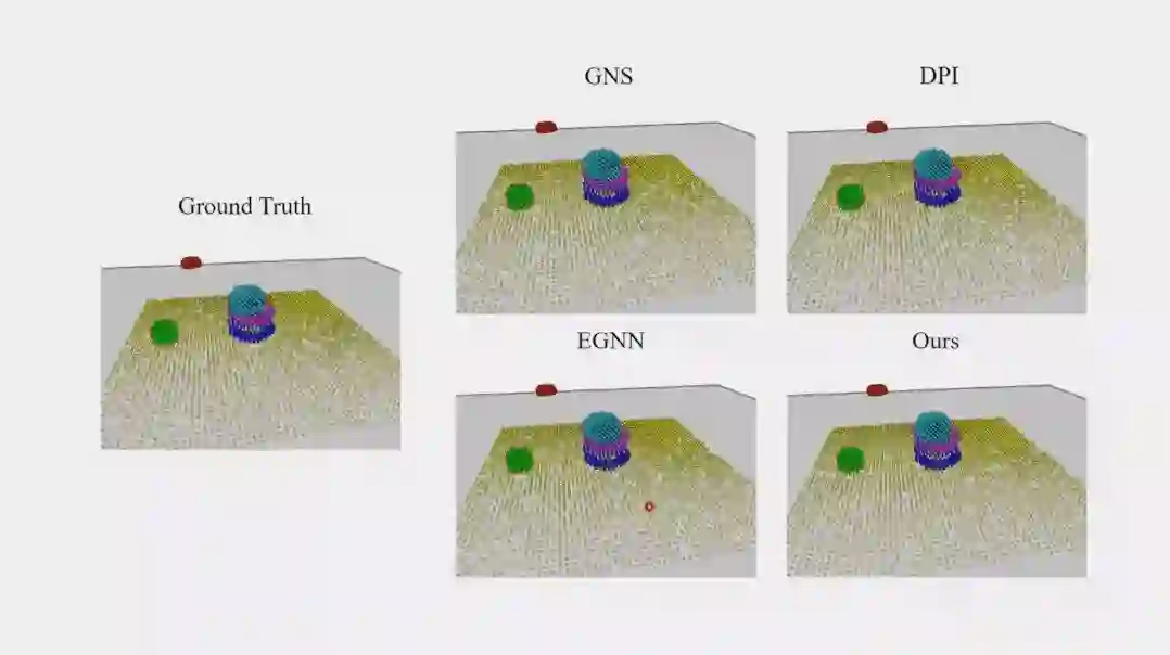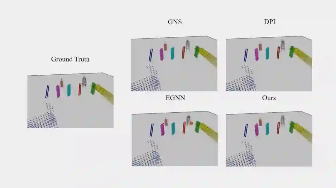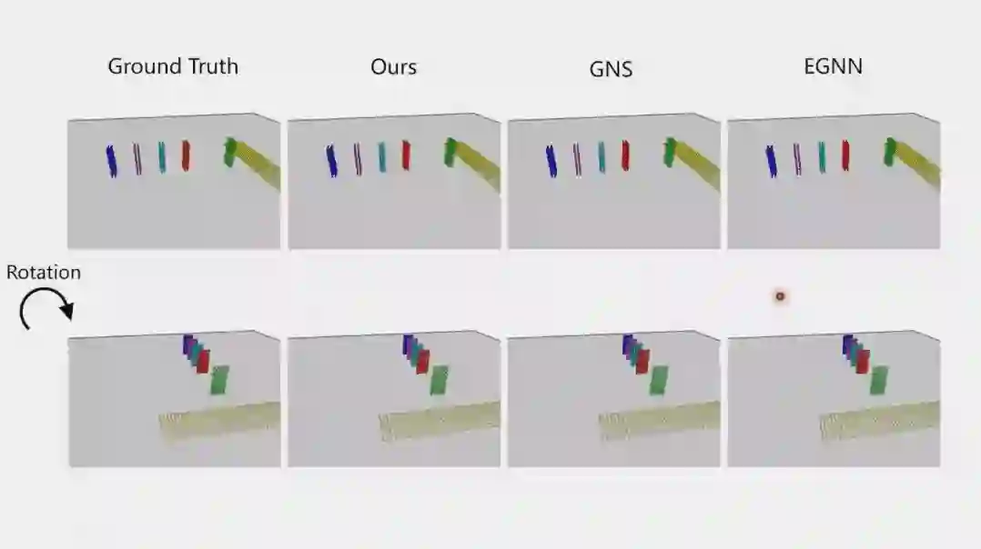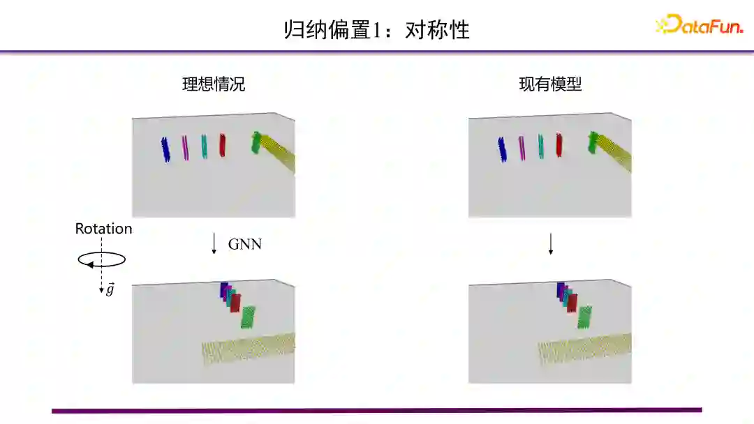 换一个例子来说,在桌子上放置一些多米诺骨牌,它们从蓝色骨牌开始相继倒下。因为它们自身只受重力过程影响,而在水平方向受力是不变的(相对于倒下的方向来说)。如果我们将场景视角旋转 90°,在理想情况下,它们仍会相继倒下;而应用现有的模型进行模拟时,我们会发现变换视角之后的粒子并不满足物理对称性,说明我们现有的 GNN 应用在物理模型中是有缺陷的。