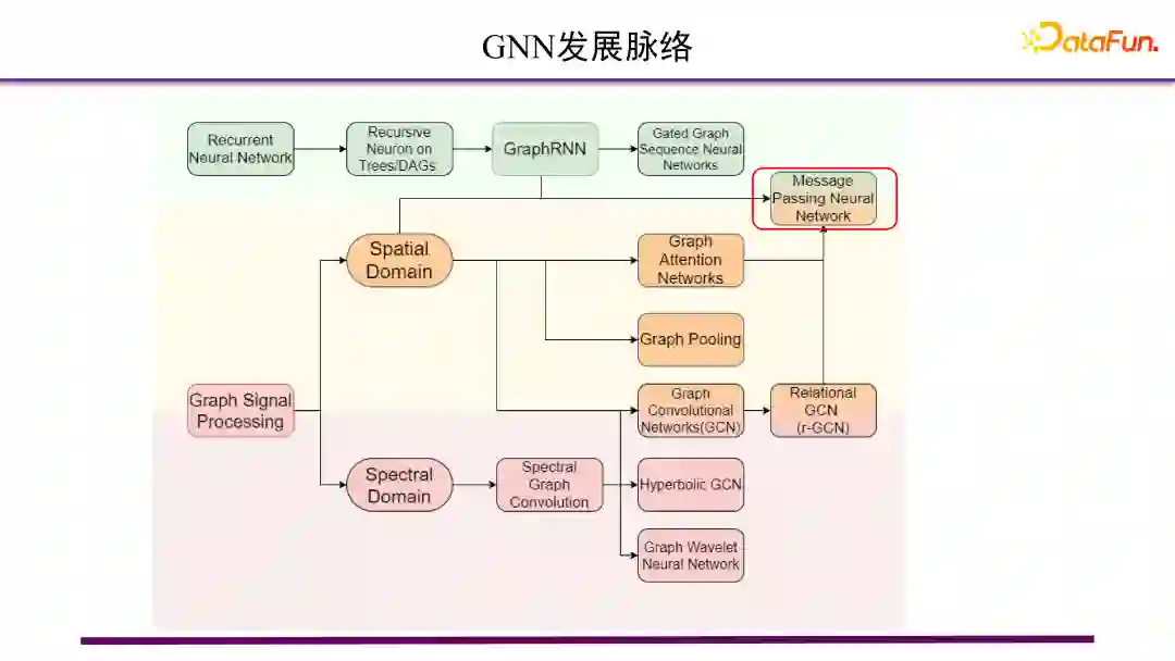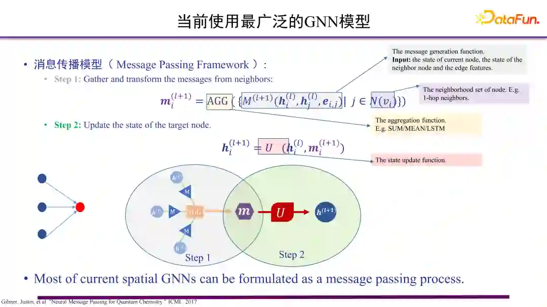 由此我们可以了解到,GNN 的发展总体可以分为两个主要路线:一条是由递归神经网络路线发展而来,另一条则由图信号处理(Graph Signal Processing)路线发展而来。两条路线相互交织,最终汇聚于我们今天所要介绍的模型——消息传递模型(MPNN, Message Passing Neural Network)。4. 当前使用最广泛的 GNN 模型——MPNN