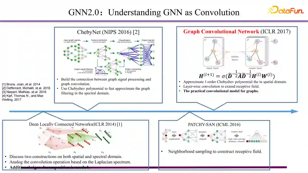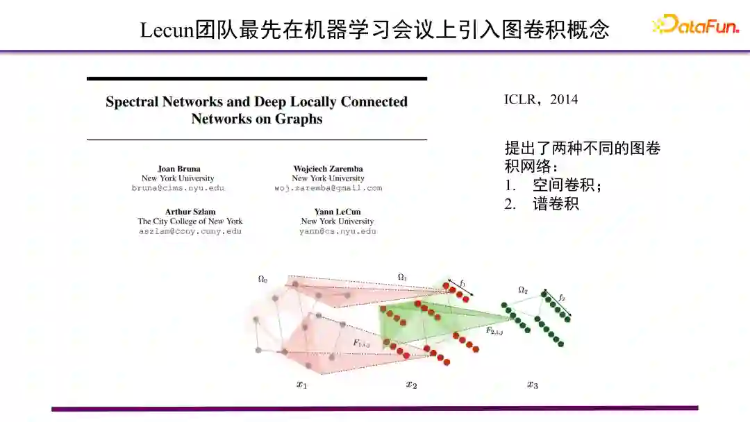 随后在 2014 年,LeCun 团队最先在 ICLR 引入了图卷积的概念,并且提出空间卷积和谱图卷积两种卷积网络。