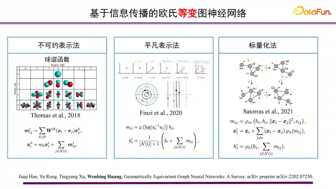 下面我们介绍现有的 GNN 模型如何体现信息的等变性与不变性。在 Geometrically Equivariant Graph Neural Networks: A Survey 中,我们介绍了基于信息传播的欧式等变图神经网络的三种表示方法——不可约表示法、平凡表示法、标量化法,它们以不同的角度将对称性嵌入到 GNN 里,从而实现等变的性质。我们以容易理解的、也更有可能有广泛应用的标量化法为例进行讲解。