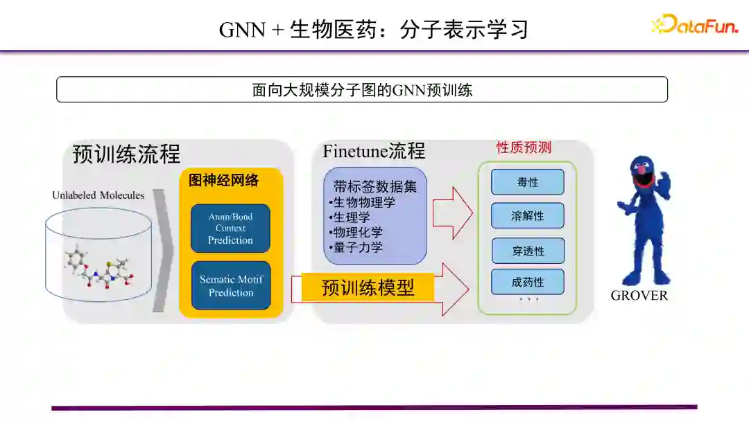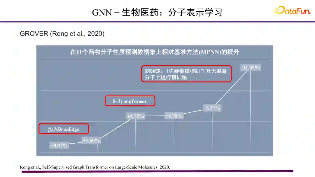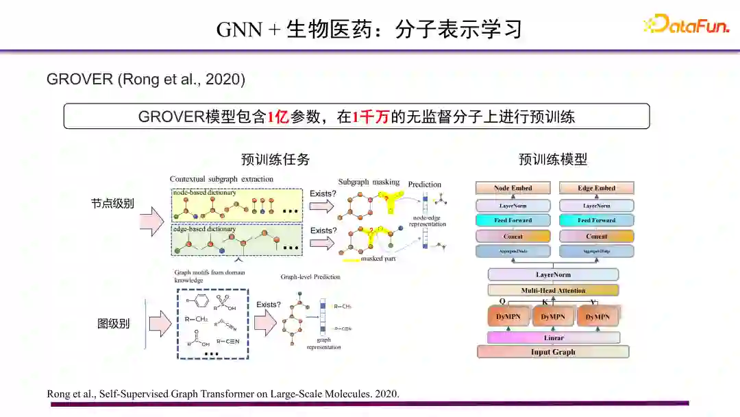 为了解决这样的预训练问题,**我们在 2020 年提出了包含了 1 亿参数,在 1 千万的无监督分子上进行预训练的 GROVER 模型,也成为当时这一任务的最大的一个模型。****