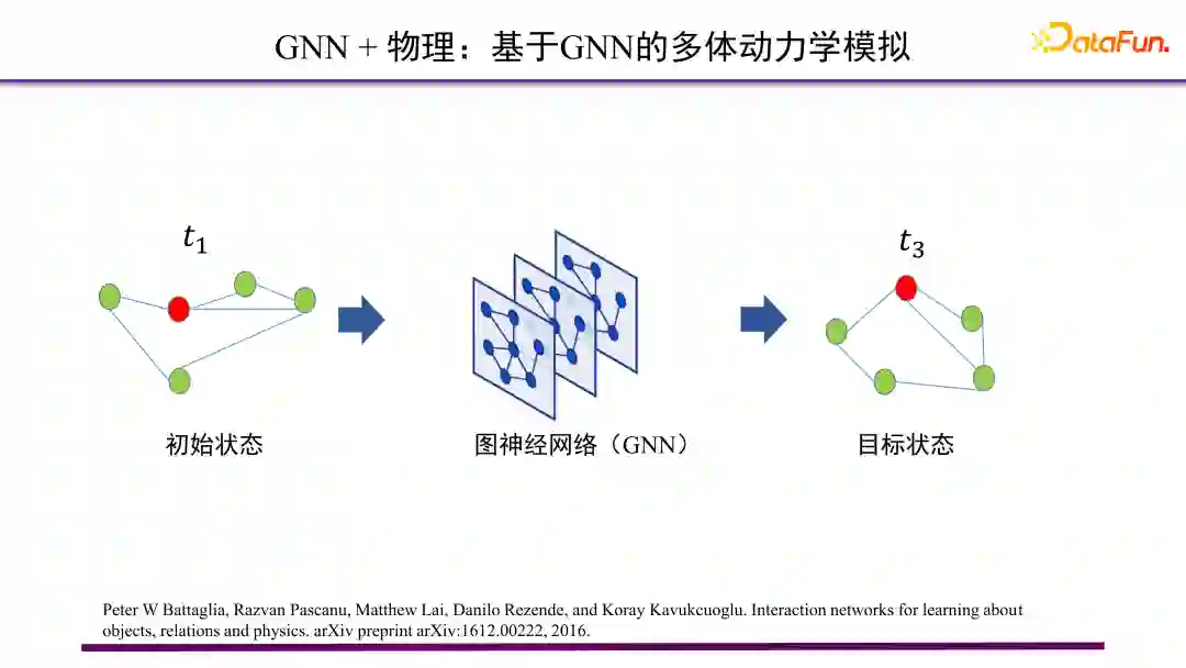 从而我们可以联想到,系统的模拟过程可以进一步退化成一个 GNN 的预测任务——即根据系统的初始状态预测系统在特定的时间点的目标状态。