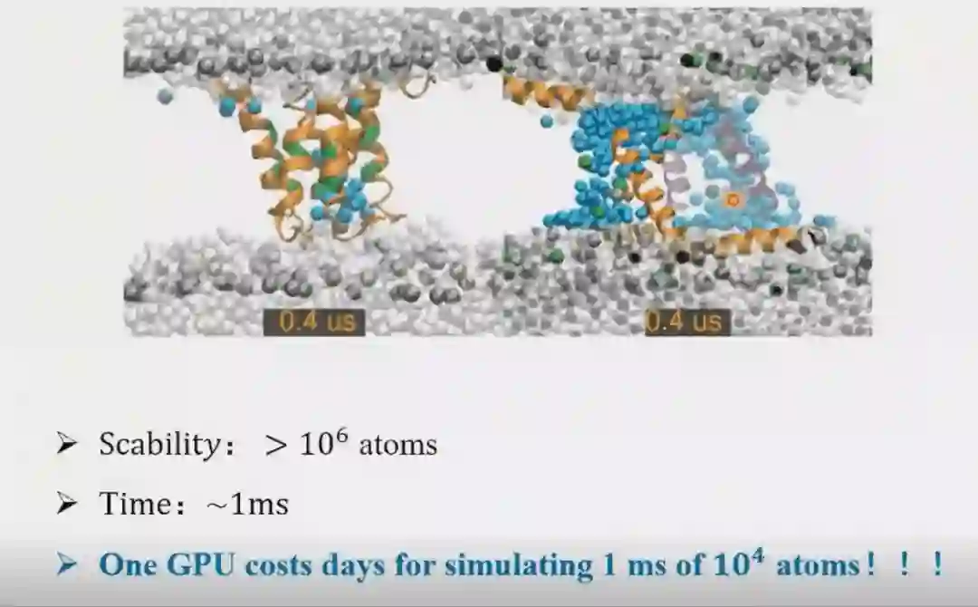 但是当我们把视角放在一些微观的、数量级巨大的场景,我们会发现通常的求解计算方法的复杂度会非常高。图中绘制出的的是蛋白质分子(彩色)在水分子(灰色)中的变化过程,由于微粒的动作单元往往在微秒(μs)或更小的数量级上,导致我们所需要的计算步数是巨大的,很难对大规模系统进行长时间的模拟。所以我们进一步思考,能否利用机器学习模型,直接从数据中挖掘物理系统的演化规律——即利用数据和知识驱动的方法代替传统方法对系统机型模拟呢?