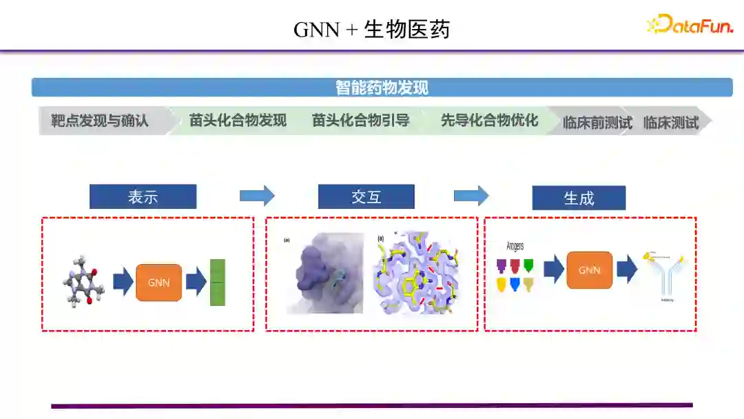 **在智能药物发现的过程中,许多步骤都可以抽象成图结构建模的过程,进而利用 GNN 方法来进行解决。**其中经典的任务包括靶点发现、苗头化合物的发现、引导、优化等等,它们被划分为表示、交互、生成等可以应用 GNN 解决的问题。例如将药物通过 GNN 表示成向量被称作表示任务,将药物和人体蛋白质或病毒结合被称作交互任务,以及利用抗原生成抗体的图生成过程。从机器学习角度来看,这里本质上还是应用 GNN 的模型进行建模,知识所用的数据(或者叫做 domain knowledge)有所不同。