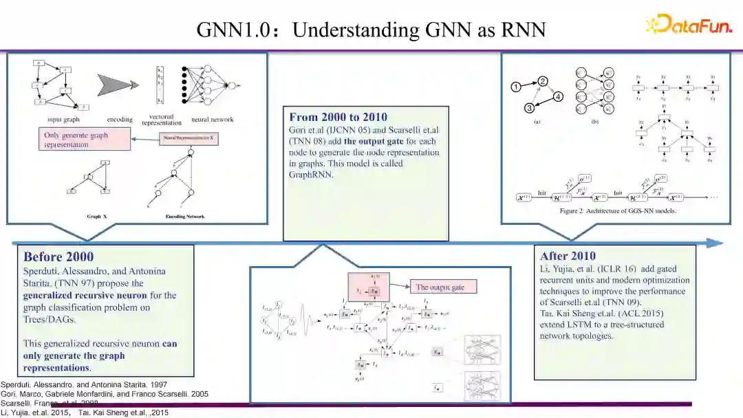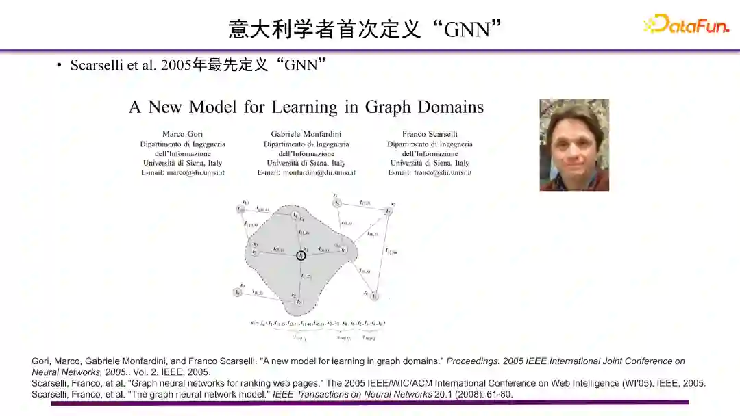 生活中我们所说的粒子一般是指分子,分子由原子组成,而原子之间又由化学键形成连边。分子本质上是一个“图”(graph);具体在医药领域,我们生命服用的小分子药物和病毒蛋白质(属于大分子)的结合也和图上的连接的概念相似;除此之外,在天体运动过程中,我们同样可以将其看作是一个全连接图(基于它们的相互作用来建边)。将科学领域的数据建模成图数据之后,我们便可以使用处理图结构的方法(如 GNN)对这些模型进行进一步表示和分析。3. 图神经网络(GNN)是处理图数据的有效工具之一关于 GNN,和我们的直接认知所不同的一点是:最早的图神经网络并不是由机器学习领域的学者提出,而是早在 1997 年由意大利学者 A. Sperduti, et al 在 Supervised neural networks for the classification of structures 文章中作为处理图结构数据的方法提出。在那之后,最近几年(2014~2021)中,图神经网络也受到越来越多的关注。在 2022年 ICLR 的 Submission Keywords 中,“graph neural network”也排到了第三名。而发布在各个顶会上的关于 GNN 的论文量也随着年份呈指数性增长。接下来我们来简单回顾 GNN 的发展历程。2005 年,几位意大利学者 Scarselli et al. 最先提出 GNN 这个词,为 GNN 的发展起到了奠基的作用。