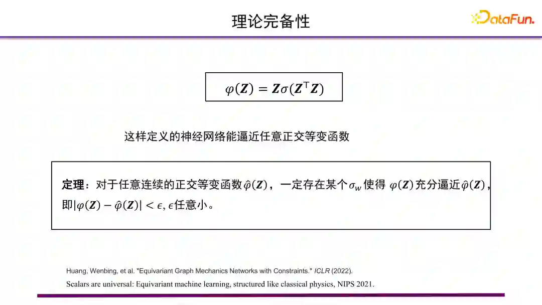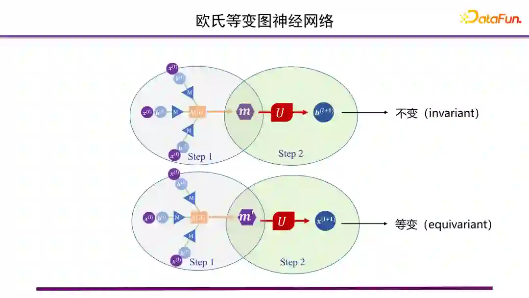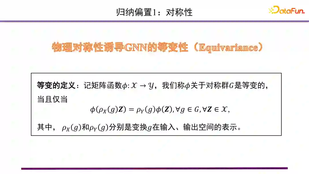 所以需要物理对称性去诱导 GNN 的等变性(Equivariance)。等变的含义是对于一个函数而言,对其输入进行变换的结果等于对其输出进行变换的结果。类似的我们也有不变的定义,其代表对输入做任何变化,输出都不变,即: