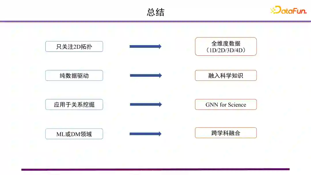最后我们可以将 GNN for Science 和传统 GNN 的区别总结为:1.从只关注 2D 拓扑到关注 1D/2D/3D/4D(时空数据)的全维度数据2.从纯数据驱动到融入科学(物理/化学/生物)知识3.从关系挖掘的应用需求到科学领域的多种应用需求4.从 ML 或 DM 领域的研究到跨学科融合的研究今天的分享就到这里,谢谢大家。