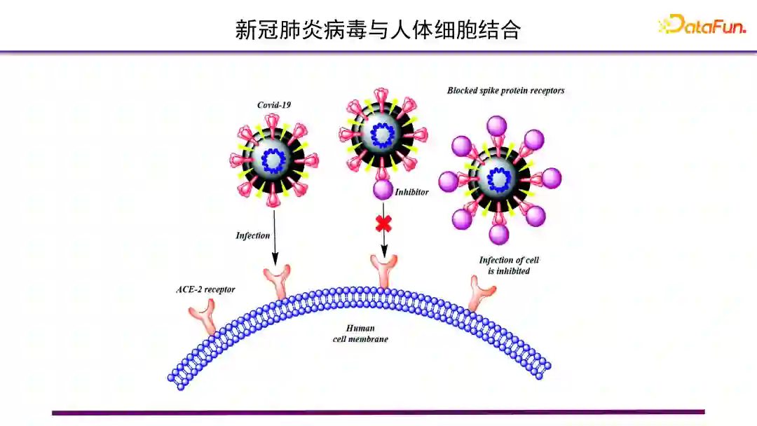 如图所示,新冠病毒致病机理的一个直观解释是:球状的新冠病毒上分布着一个个刺突蛋白,通过刺突蛋白和 ACE-2 受体的结合,病毒得以进入细胞并使细胞坏死,从而使器官功能受损。一个阻断致病的方法是, 驱使 Inhibitor(通常是我们人体自身的抗体或者药物抗体)去与病毒的刺突蛋白进行结合,减弱病毒感染细胞的能力。从而问题转换为,如何去设计实现“结构”上的功能和特点,从而达到我们的目的。而这里的“结构”便是我们需要去构建的图结构,进而我们可以应用 GNN 的方法去解决问题。