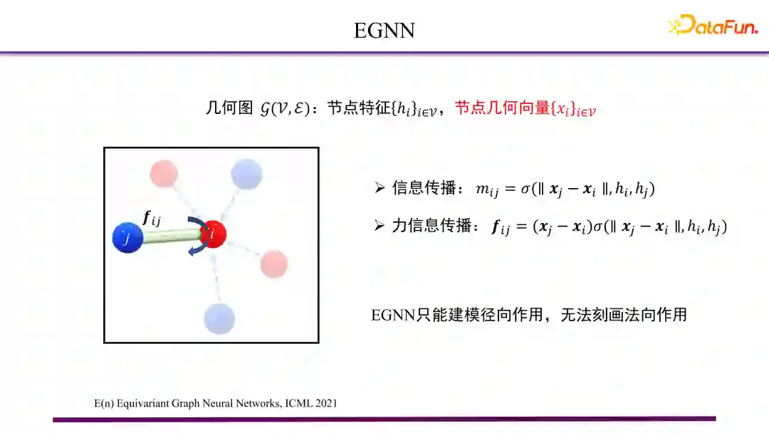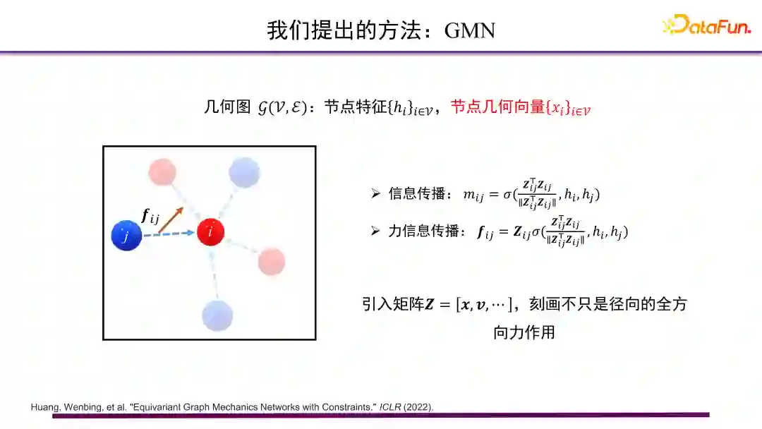 在我们最新提出的方法 GMN 中,使用了包含位置、速度等几何信息构成的矩阵代替单一的位置向量,从只能进行径向力的刻画转变为全方向力的刻画。从理论上我们也证明了 GMN 能够刻画 GNN 的等变性。