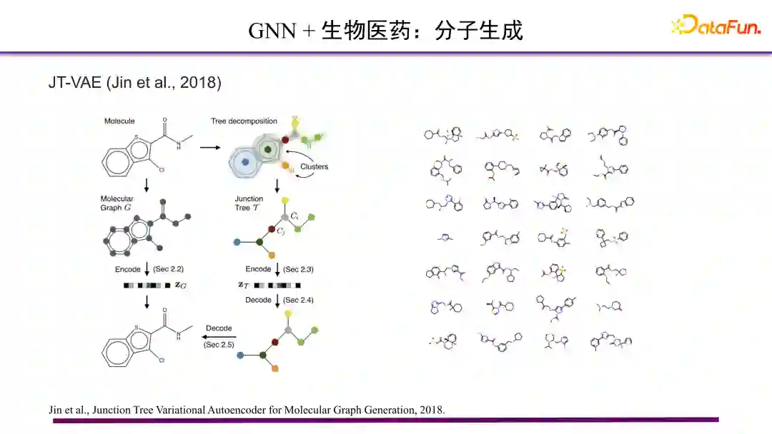 面向分子生成任务,MIT 在 2018 年提出了 JT-VAE 方法,其主要思想是用 GNN方法生成图结构(包括原子、化学键)。03