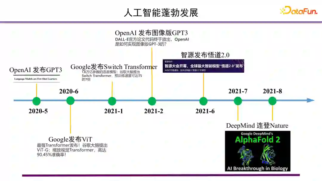 最近几年来,人工智能领域的前沿研究主要着眼于基于大规模无标注数据的模型预训练,从 2020 年以来,GPT3、ViT、Switch Transformer 等语言、视觉模型的提出,成为当前研究的主流趋势。而 DeepMind 在 2021 年提出的 AlphaFold2 模型,也使机器学习方法在生物领域成功落地,并成为使机器学习从处理经典 AI 任务的数据(如图像和自然语言)到处理科学数据(如生物、物理领域的数据)的一个新的转折点。