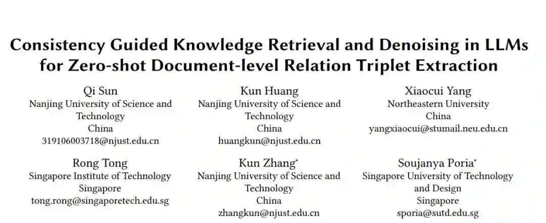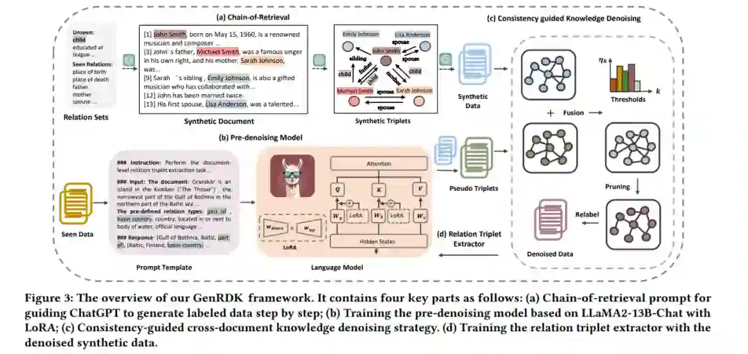 文档级关系三元组提取(DocRTE)是信息系统中的一项基础任务,旨在从文档中同时提取具有语义关系的实体。现有的方法在很大程度上依赖于大量的完全标记数据。然而,为新兴关系收集和注释数据是耗时且劳动密集的。最近的先进大型语言模型(LLM),如ChatGPT和LLaMA,展示了令人印象深刻的长文本生成能力,激发了我们探索一种获取带有新关系的自动标记文档的替代方法。在本文中,我们提出了一种零样本文档级关系三元组提取(ZeroDocRTE)框架,该框架通过从LLM中检索和去噪知识来生成标记数据,称为GenRDK。具体来说,我们提出了一种链式检索提示,以引导ChatGPT逐步生成带标签的长文本数据。为了提高合成数据的质量,我们提出了一种基于跨文档知识一致性的去噪策略。利用我们的去噪合成数据,我们继续对LLaMA2-13B-Chat进行微调,以提取文档级关系三元组。我们在两个公共数据集上进行了零样本文档级关系和三元组提取的实验。实验结果表明,我们的GenRDK框架胜过了强基线方法。
