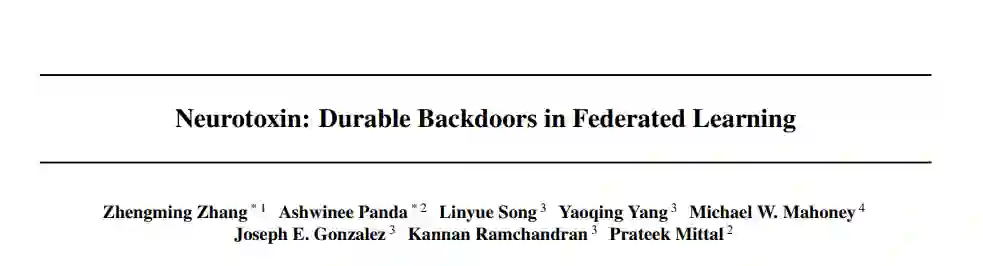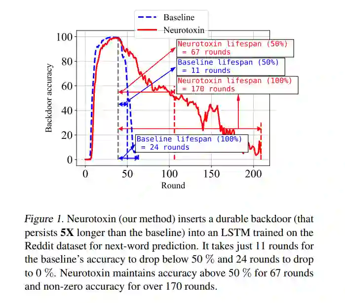 由于其分散的性质,联邦学习(FL)系统在其训练过程中有一个内在的弱点,对抗后门攻击。在这种类型的攻击中,攻击者的目标是使用有毒的更新将所谓的后门植入到学习的模型中,这样,在测试时,模型的输出可以固定到特定输入的给定目标上。(举个简单的玩具例子,如果用户在一个手机键盘应用程序中输入“来自纽约的人”,该应用使用了一个后门的下一个单词预测模型,那么该模型就会自动补全句子,变成“来自纽约的人很粗鲁”)。之前的工作已经表明后门可以插入FL模型,但是这些后门通常是不持久的,也就是说,在攻击者停止上传有毒的更新后,它们不会留在模型中。因此,由于训练通常在生产FL系统中继续逐步进行,插入的后门可能直到部署才会存在。在这里,我们提出了Neurotoxin,一个简单的一行修改现有的后门攻击,通过攻击参数在训练中改变较小的量级。我们对十项自然语言处理和计算机视觉任务进行了详尽的评估,发现我们可以将最先进的后门的耐用性提高一倍。