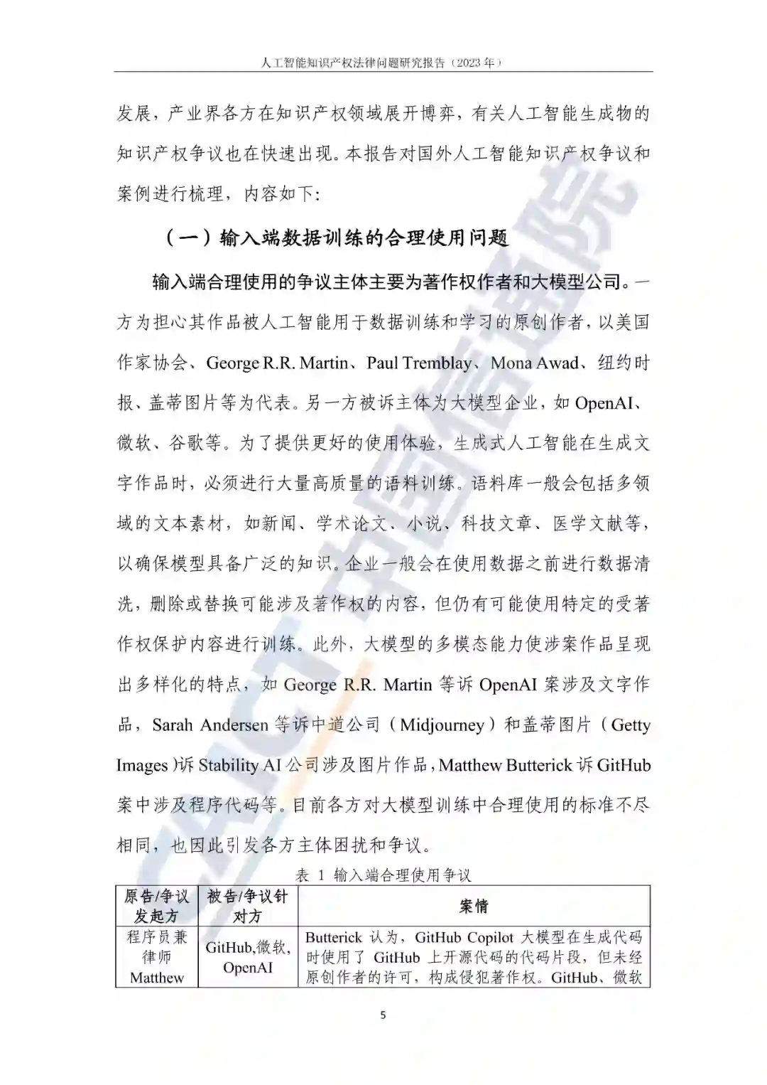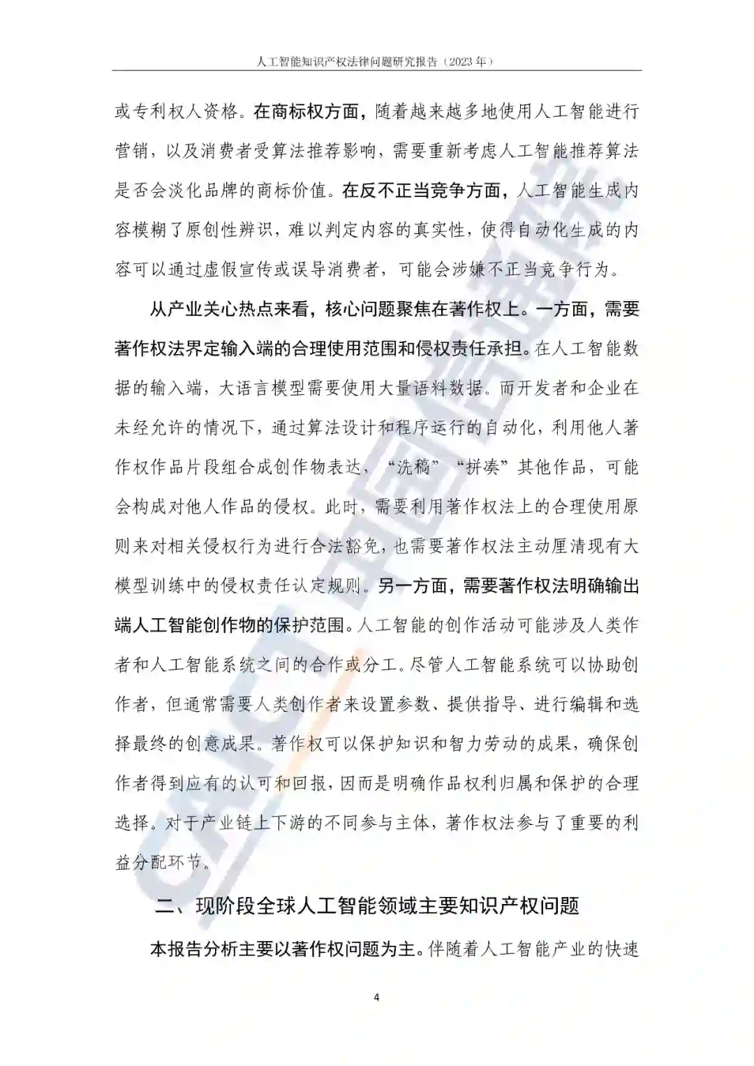 人工智能被视为引领未来产业发展的战略性新兴技术,正在推动着一场全新的科技变革和产业创新。从发展阶段来看,深度学习技术的快速突破正在驱动人工智能以前所未有的速度逼近通用智能。从商业化落地来看,人工智能行业主流产品形态是生成式人工智能。而知识产权问题是企业对于使用生成式人工智能的首要担忧,人工智能技术在多方面挑战现有知识产权法律体系,尤其是著作权法律规则。一是需要著作权法界定输入端的合理使用范围和侵权责任承担;二是需要著作权法明确输出端人工智能创作物的保护范围。 2. 人工智能领域全球知识产权治理相关实践各方都在积极寻求解决人工智能领域知识产权问题的路径。美国政府加速法律问题研究,产业主体主动承担训练数据和作品的侵权责任;日本通过明晰人工智能数据训练中的合理使用标准,平衡企业和原创作者间的关系;欧盟以促进产业发展的数据挖掘原则为抓手,推进著作权治理向精细化方向发展;中国通过立法和司法协同,探索人工智能知识产权最佳保护模式。 3. 人工智能知识产权治理展望