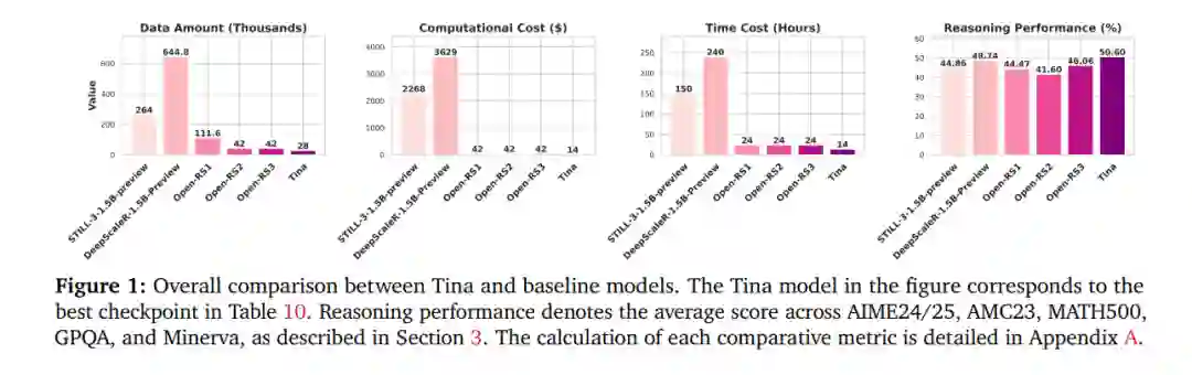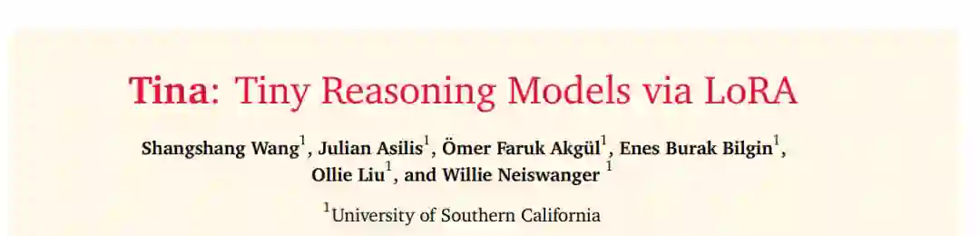 为解答这个问题,我们有意选择极简化路径。与动辄数百亿参数的大模型(如 Qwen-7B/32B、QwQ-32B-preview 等 [Min 等, 2024;NovaSky Team, 2025;Zeng 等, 2025;Muennighoff 等, 2025;Cui 等, 2025;Lyu 等, 2025;OpenThoughts Team, 2025;Hu 等, 2025])不同,我们聚焦于小型模型,尤其选用 DeepSeek-R1-Distill-Qwen-1.5B(参数规模仅 15 亿)作为基础模型。该模型因其基因(来自 DeepSeek/Qwen 系列)和蒸馏过程,预期具备比同规模通用预训练模型更强的初始推理能力。这一战略性选择有助于更严格地评估 RL 的增量效果,从而更准确地量化 RL 技术本身的贡献。 更重要的是,选用小型架构显著降低了实验门槛。为了进一步提升 RL 阶段的效率,我们引入了低秩适配(LoRA)(Hu 等, 2021)作为参数高效的后训练手段。LoRA 允许仅通过训练极少量的新参数改变模型行为,与我们追求以最经济方式实现推理能力的核心动机高度契合。 通过将“小模型架构”与“LoRA 强化学习微调”结合,我们提出了 Tina 模型家族(Tiny Inference Architecture),实现了在极低成本下的显著推理性能。我们工作贡献如下: