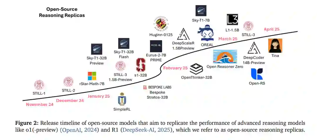 语言模型(Language Models,LMs)在多种任务中表现出日益增强的能力,但在实现稳健的多步推理方面仍面临挑战(Wang 和 Neiswanger, 2025;Xu 等, 2025)。推理能力对于许多需要复杂问题求解的应用至关重要,如科学发现、复杂规划等。通过监督微调(Supervised Fine-Tuning, SFT)增强复杂推理能力是目前常见的做法,通常依赖于知识蒸馏过程(Min 等, 2024;Huang 等, 2024),模型通过模仿更强模型(如 OpenAI 的 o1,2024)生成的推理轨迹(例如逐步思考)来进行学习。这种方法虽然有效,但依赖于高质量的专家演示,这些演示通常获取成本高昂。此外,这种模仿过程也可能导致模型仅习得表层的“复制”,而非发展出动态推理路径的能力。 相比之下,强化学习(Reinforcement Learning, RL)允许模型直接从可验证的奖励信号中灵活学习(DeepSeek-AI, 2025;Lambert 等, 2025),促使模型探索更多逻辑路径,甚至可能发现更具鲁棒性的解法。然而,传统的 RL 流程通常结构复杂,且极为耗费计算资源。这也引出了我们研究的核心问题: 如何以更低成本有效地通过强化学习赋予语言模型推理能力?