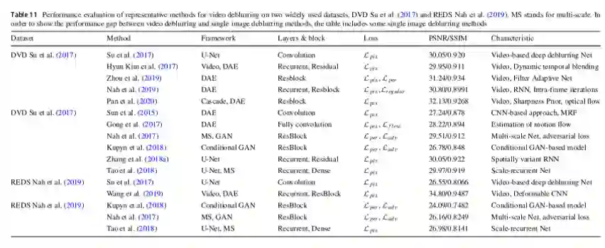 当模糊图的模糊核未知时,图像去模糊任务被称为盲图像去模糊。早期的盲图像去模糊方法侧重于去除均匀的模糊核。然而,真实世界的模糊图像,其不同区域通常是由不同的模糊核生成,因此其模糊核是非均匀的。为了解决盲图像的去模糊任务,多种基于深度学习的图像去模糊算法被提出。本文在下面表格中总结了现有的基于深度学习的盲图像去模糊方法,这些方法通常采用各种不同的网络框架,包括多尺度网络、对抗神经网络、级联网络、再模糊网络等等。