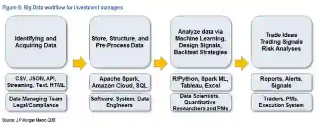 数据科学团队由量化研究人员组成,借助机器学习、反向测试策略和可视化技术分析数据,根据数据推导出可交易信号或见解。最后,信号由投资组合经理实施,或者在某些情况下以自动化方式执行(这将涉及到系统的另一层和将信号链接到执行系统的软件专家)。