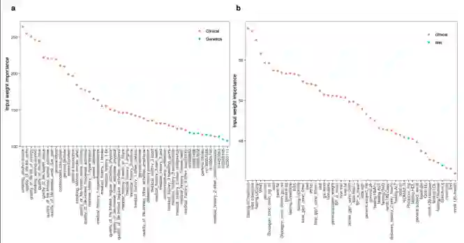 潜伏空间中重要的临床特征 为了说明该模型如何很好地捕获临床数据的结构,作者分析了连接到编码器输入变量的神经网络权重。在这里,作者发现大多数临床和饮食变量都是最重要的50个变量之一。