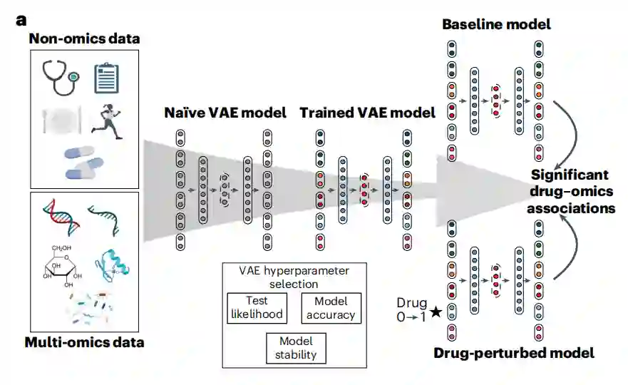 在之前的研究中,作者在变分自编码器(VAE)的基础上开发了一个深度学习框架,用于大量非结构化宏基因组数据的集成和分箱,发现VAE可以在没有任何先验知识或统计模型的情况下学习整合两个数据集。该框架利用了VAE的解码器作为一个生成模型,最终训练的解码器将能够从学习的潜在分布中生成新的数据示例。对于作者的多模态数据,作者假设VAE的生成能力将允许作者识别患者暴露和组学特征之间的关联。MOVE方法能够将多组学数据与临床和分类数据整合在一起,并且能够抵抗数据中的系统性偏差以及大量缺失数据。作者比较了药物的多组学特征,发现不同的药物具有独特的临床和分子特征。该MOVE是免费提供的,易于扩展,可以集成任意数量的分类和连续数据集,并能够识别多组学关联的特征。
