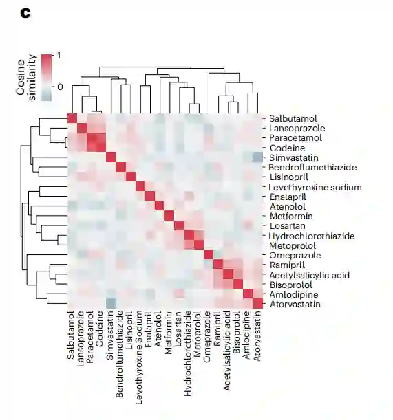 作者研究了药物-药物组合对相关性的影响,发现总体药物关联相似性与服用两种药物的个体之间存在相关性(PCC 0.75, P值为2.2 × 10−35)。这一发现表明,同时服用两种药物可能会产生多药效应,从而在所有临床和多组学变化中产生更高的药物-药物相似性。此外,具有最相似的药物和多组学关联的药物是可待因和扑热息痛,余弦相似度为0.78。