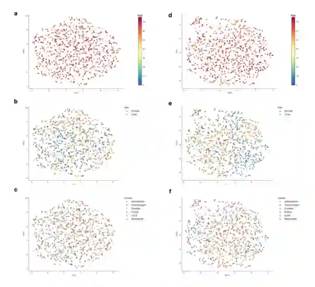 作者还使用KNN分类器来研究混杂因素性别和招募中心对潜在表征的整体结构的影响。这些对性别和营救中心分别实现了0.58和0.25的精度,应与分别为0.50和0.17的偶然精度进行比较。这证明了VAE集成异构数据的能力,但也证明了大量的混杂因素可以影响模型潜在的表示。