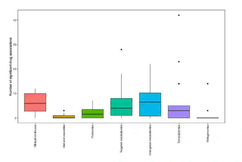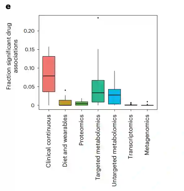 当作者将亚组分析显著的药物组学关联时,其中肠道微生物组中只有两种药物具有显著关联(二甲双胍和奥美拉唑),作者发现,与其他多组学数据集的效应量相比,这两种药物的效果相似或更低。这一观察结果表明,多组学对药物刺激的反应不仅针对肠道微生物组,而且说明试图了解药物作用时应包括多组学数据集。