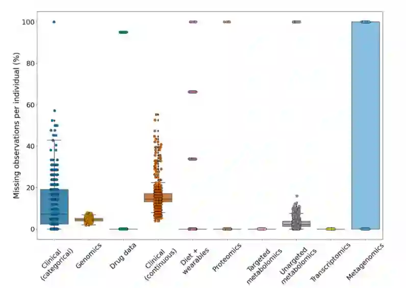 设计VAE 作者使用了789个新诊断的T2D个体的数据集,具有广泛的多组学特征。在组学数据集中,每个个体总共包含8807个变量,中位缺失量小于5%,宏基因组数据除外,其中三分之二的个体(532)没有任何数据。因此,这些个体在多组学数据中的缺失量高达24.7%。对于临床数据缺失较高,连续和分类临床数据的个体中位数分别为14%和7%。