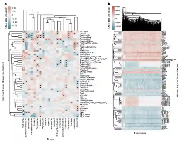 T2D生物标志物的变化与二甲双胍有关 作者调查了药物和多组学的相互作用,并最初关注预期的临床药物相互作用。例如,对于二甲双胍,作者在所有数据集中确定了88个重要的临床和多组学相互作用。在调查个体间的关联时,作者发现患者内部的低变异性表明变化是稳定的。经过试验,作者发现二甲双胍与胰岛素清除率、GLP-1活性、混餐糖耐量试验血糖水平、葡萄糖敏感性和血压等12项T2D临床标志物显著相关。