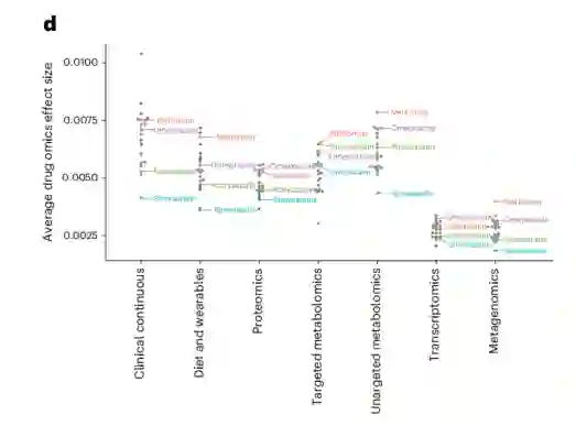 药物的影响在组学数据中广泛存在 作者发现肠道微生物组是所有药物中具有统计学意义的命中次数第二少的数据集,有17个显著关联。只有饮食和可穿戴数据的相关性较低(11);转录组学、蛋白质组学、靶向代谢组学和非靶向代谢组学有44-134个显著相关性。然后,作者询问了不同数据集中药物的效应量是否不同,并确定了各自多组学数据集中药物的累积效应量。在这里,作者发现转录组和宏基因组数据中的平均效应值是所有药物中最低的,而宏基因组数据集中的平均效应值显著低于除转录组外的所有其他组学数据集(ANOVA, Tukey HSD检验,校正后P < 0.05)。