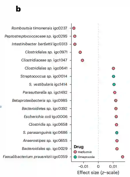 二甲双胍和奥美拉唑与肠道菌群的关系 最近的研究表明,药物摄入影响人体肠道微生物组的组成。在此,作者发现二甲双胍和奥美拉唑是唯一与宏基因组数据有显著关联的药物,增加了11个宏基因组物种,而减少了6个其他物种。
