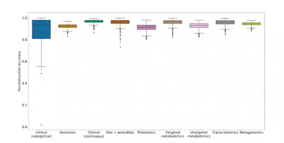 对此,作者设计的MOVE框架在输入数据类型的数量方面是灵活的,并且能够处理连续和分类特征。为了确定最优的超参数,既能捕捉数据的结构,又不会失去对未见过的个体进行泛化的能力,作者将数据集分为训练集和测试集。然后,作者测量了模型重构输入的能力,以及将模型多次改装到数据时的稳定性。重建精度的中位数在0.95-1之间,当重新训练5次时,最终模型高度稳定,潜在空间余弦相似度的平均变化为0.037。这证明VAE模型能够在个体之间以较高的精度重建数据。
