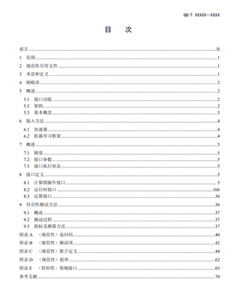 《人工智能 异构人工智能加速器统一接口》标准定义了异构人工智能加速器的统一接口及其语义,给出了各加速器为实现此接口所需的接入方法、使用方法和试验方法。 该标准适用于人工智能加速器接口的设计和实现,也可为人工智能加速器应用提供参考。 该标准主要技术内容包括: (1)异构人工智能加速器统一接口概述,包括接口、接入方法、精度、接口参数等; (2)接口定义,包括模型操作接口、运行时接口、运算接口等;(3)符合性测试方法,包括测试过程、指标及测量方法等;(4)附录,包括 A 返回码(规范性)、B 测试项(规范性)、C算子定义(规范性)、D 枚举(规范性)、E 领域接口(资料性)。