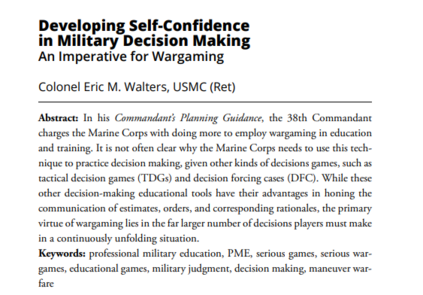 美第38任司令官在他的《司令官规划指南》中,责成美海军陆战队在教育和训练中更多地采用兵棋推演。鉴于其他类型的决策游戏,如战术决策游戏(TDG)和决策强制案例(DFC),往往不清楚为什么需要使用这种技术来练习决策。虽然这些其他决策教育工具在磨练估计、命令和相应理由的沟通方面有其优势,但兵棋推演的主要优点在于玩家必须在不断展开的情况下做出更多的决策。