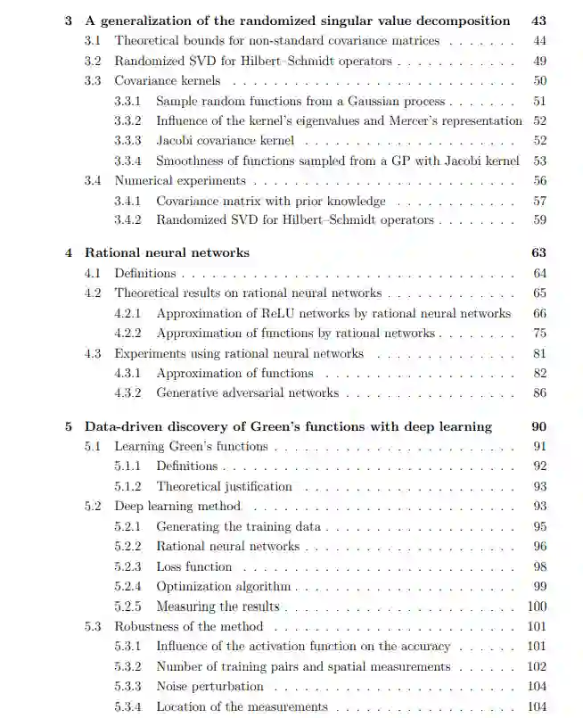 从数据中发现隐藏的偏微分方程(PDEs)和算子是机器学习和数值分析之间的一个重要前沿课题。介绍了线性偏微分方程格林函数学习的理论结果和深度学习算法,并对偏微分方程格林函数学习技术进行了严格论证。导出了一个理论上严格的算法来获得学习率,它表征了近似学习与椭圆偏微分方程相关的格林函数所需的训练数据量。该结构通过将随机奇异值分解扩展到非标准高斯向量和Hilbert-Schmidt算子,利用层次矩阵利用格林函数的低秩层次结构,连接了PDE学习和数值线性代数领域。引入有理神经网络,由具有可训练有理激活函数的神经网络组成。这些网络的高组成结构,结合有理逼近理论,意味着有理函数比标准激活函数具有更高的逼近幂。此外,有理神经网络可能具有极点并具有任意大的值,这非常适合逼近具有奇点的函数,如格林函数。最后,结合格林函数和有理神经网络的理论成果,设计了一种从数据中发现格林函数的人类可理解的深度学习方法。这种方法补充了最先进的PDE学习技术,因为可以从学习到的格林函数中获得广泛的物理知识,如主导模、对称和奇点位置。本文旨在通过将标准数学领域(如数值线性代数、概率和偏微分方程分析)与现代深度学习技术相结合,了解是否可以从数据中发现偏微分方程(PDEs)。我们着重学习与线性偏微分方程相关的格林函数从一对强迫函数和解。推导了挖掘问题规律性的理论边界,提出了一种实用的深度学习算法。