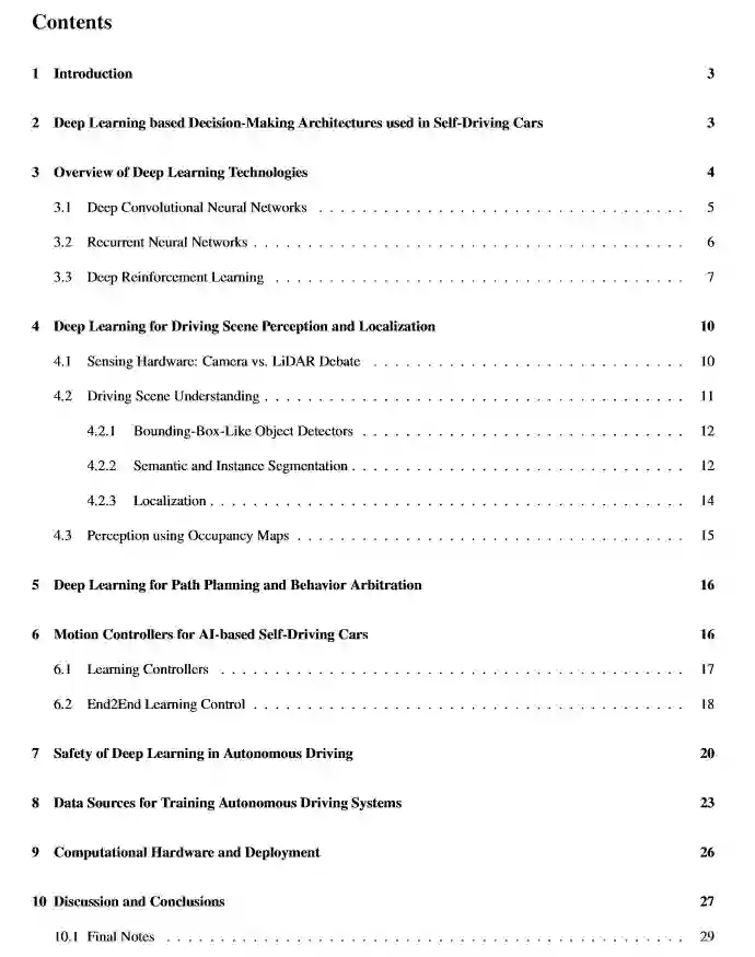 简介: 本文目的是研究自动驾驶中深度学习技术的最新技术。首先介绍基于AI的自动驾驶架构、CNN和RNN、以及DRL范例。这些方法为驾驶场景感知、路径规划、行为决策和运动控制算法奠定基础。该文研究深度学习方法构建的模块化“感知-规划-执行”流水线以及将传感信息直接映射到转向命令的端到端系统。此外,设计自动驾驶AI架构遇到的当前挑战,如安全性、训练数据源和计算硬件等也进行了讨论。该工作有助于深入了解深度学习和自动驾驶AI方法的优越性和局限性,并协助系统的设计选择。