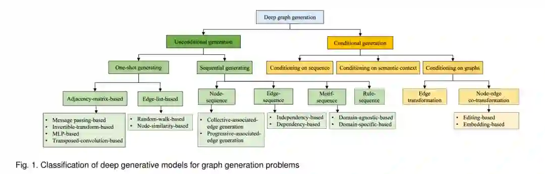 在深度图生成方面已经开展了各种先进的工作,从一次性图生成到顺序图生成过程,适应了各种深度生成学习策略。这些方法旨在通过不同领域的工作解决上述挑战中的一个或几个,包括机器学习、生物信息学、人工智能、人类健康和社交网络挖掘。但是,不同的研究领域开发的方法往往使用不同的词汇,从不同的角度解决问题。此外,缺乏标准和全面的评估程序来验证所开发的图的深度生成模型。为此,本文对用于图生成的深度生成模型进行了系统的综述。目的是帮助跨学科研究者选择合适的技术来解决其应用领域的问题,更重要的是帮助图生成研究者理解图生成的基本原理,并识别深度图生成领域的开放研究机会。据我们所知,这是第一次对用于图生成的深度生成模型的全面综述。下面,我们总结了这次综述的主要贡献: