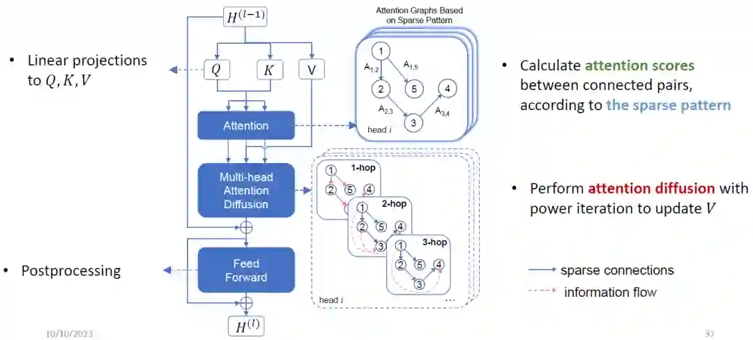 这样做可以节省时间和空间,但也有一些挑战。如果我用局部窗口的话,感受野就会降低,也就是我没法直接在每一层通过算自注意力机制来增加模型的表达能力。还有一个问题是它可能会对序列的扰动敏感,不够鲁棒。为此,我们希望模型能够具有全局注意力,并且降低模型复杂度。在AAAI的工作中,我们把稀疏Transformer当成一个稀疏图,然后通过图扩散的方式来扩散注意力的值,从而在Transformer模型上探索结构。这样做的好处是很多格子是通过扩散算出来的,不需要反向传播,从而能够节省很多计算和存储开销。Feng A, Li I, Jiang Y, et al. Diffuser: efficient transformers with multi-hop attention diffusion for long sequences[C]//Proceedings of the AAAI Conference on Artificial Intelligence. 2023, 37(11): 12772-12780. 图6 diffuser的扩散方式