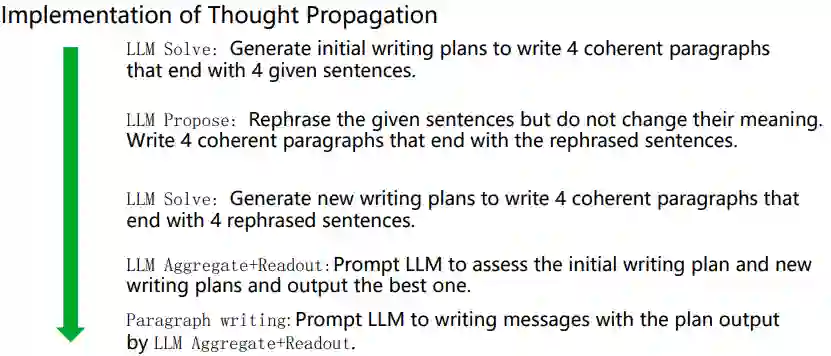 思维传播包含如下几个步骤。首先,LLM Solve使用基础的提示方法解决输入的问题。然后,LLM Propose是指提示LLM去提出一些相似的问题,这些问题都可以用LLM来解决。然后我们会分别得到一些解,这些解就是模型对于之前问题的回答。然后根据这些回答,我们进行聚合或者投票来得到当前问题的回答,这就叫 LLM Aggregate。最后的LLM Readout就是判断新的解和旧的解哪个更好,或者二者能否结合得到更好的解。Yu J, He R, Ying R. Thought Propagation: An Analogical Approach to Complex Reasoning with Large Language Models[J]. arXiv preprint arXiv:2310.03965, 2023.