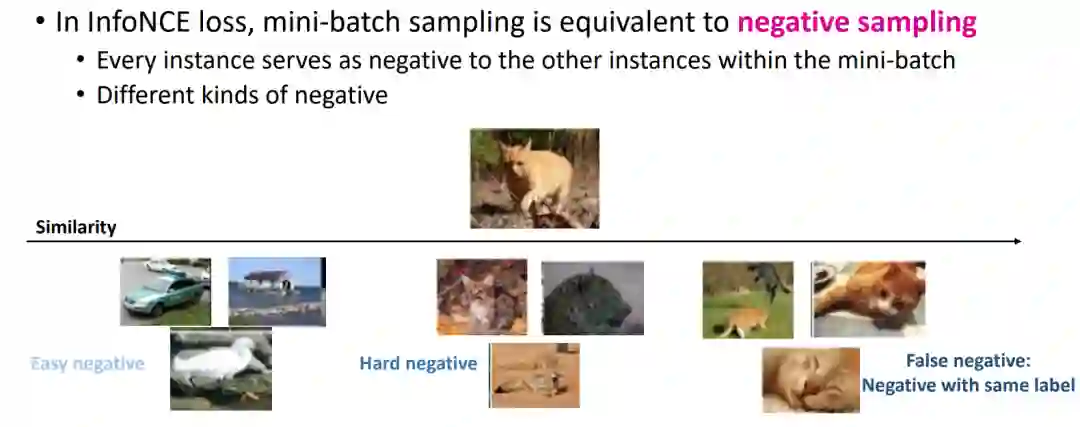我们想象什么样的负例会更有用,看一下可能会出现什么样的负例。我们可以有简单负例(easy negative),例如图3中最左边的负例跟一开始的图像完全不同。即便这个模型非常笨它也能够区分出它们不同。然后中间是稍微难一些的负例,这些负例就比较有趣,比如说它们可能都是猫科动物,但是它们可能是不同的动物,那这些就是一些困****难负例(hard negative),因为模型需要有更多的知识才能发现它们是不同的东西。然后最右边叫做伪负例(false negative),因为它们其实是同一个物种,所以模型没有必要把它们当做负例。如果是负例的话,通过InfoNCE这些负例之间的距离在嵌入空间上很远,这没必要,因为它们都是同一种。或者说即便我们需要区分,但是它们不应该被拉得非常远。然后在这三种里面什么对增加模型的表现能力更有效?很显然大家都会觉得是困难负例,因为它可能比较像,但是并不完全一样。所以这更能够考验模型的辨识能力。所以困难负例是我们比较关心的,然后它可以是有不同的表现形式。比如说它们可以是背景、花纹比较相似,但其实是不同的动物。