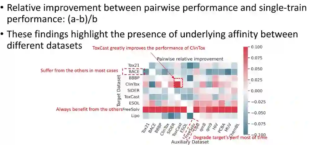 图上的预训练任务通常可以是生成式任务也可以是对比式任务,但对于分子结构来说仍然是一个非常有挑战性的话题。首先,有标注的数据集很少,往往需要昂贵的领域知识来建立。然后往往它们用的分子也都是不一样的。一个比较自然的想法是说,因为这些下游任务都非常小,所以我们能不能结合多个下游任务,比如把几个毒性相关的下游任务和数据放在一起来做微调。通过从基础模型微调的形式去改进可能会是一个更加有效的策略。但这样做有一个问题就是很容易出现负迁移。我们观察一个数据集是否能帮助另一个数据集,红色表示提升很明显。我们可以看到有些规律,例如几乎所有数据集都可以帮助FreeSolv数据集。